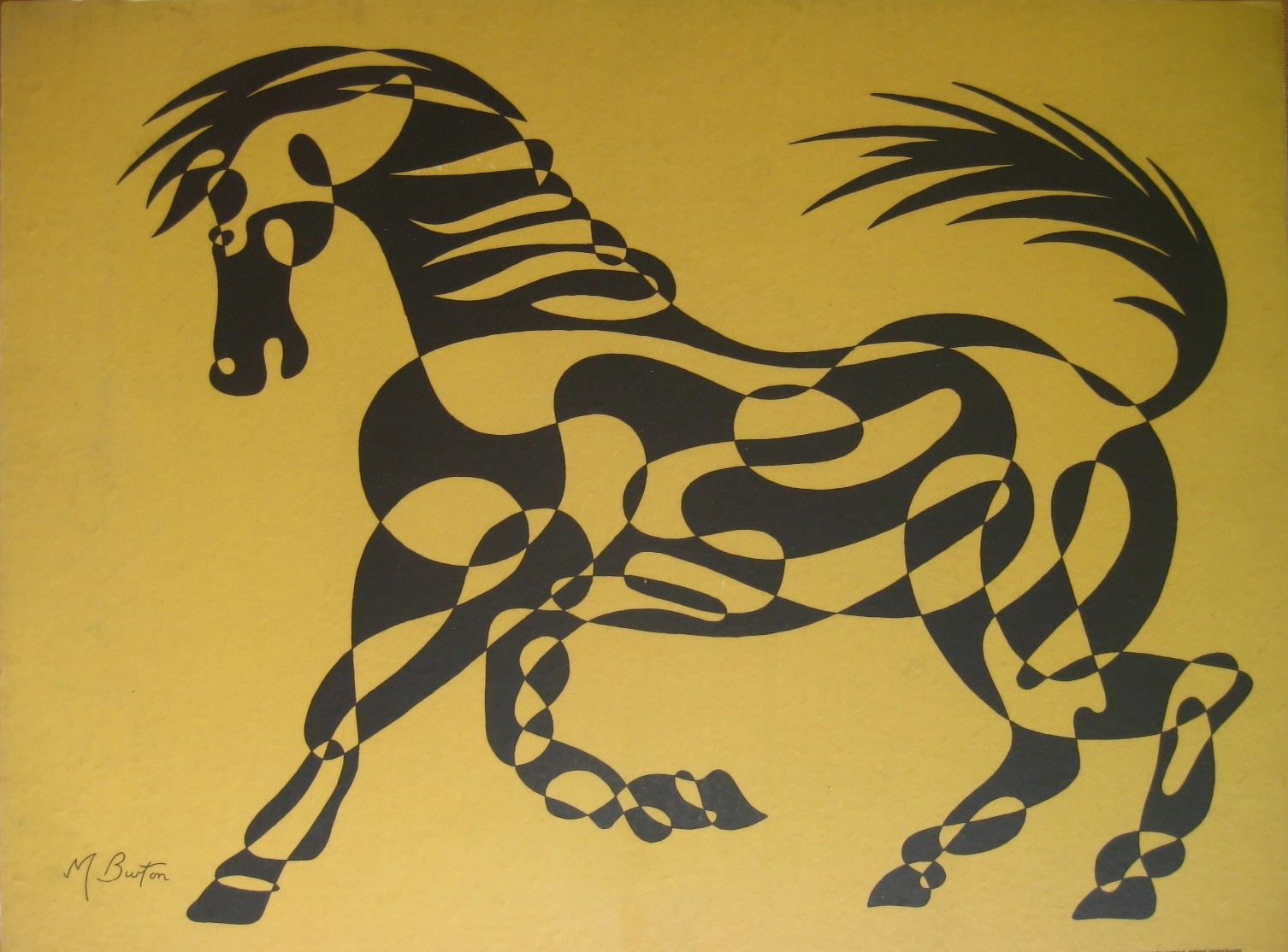 018. 1969-3. Horse, screen print. Dark brown, gold. ← Previous Next → Horse, single continuous line drawing, large screen print, Northern Screenprints Ltd 1969. Mick Burton, continuous line artist.