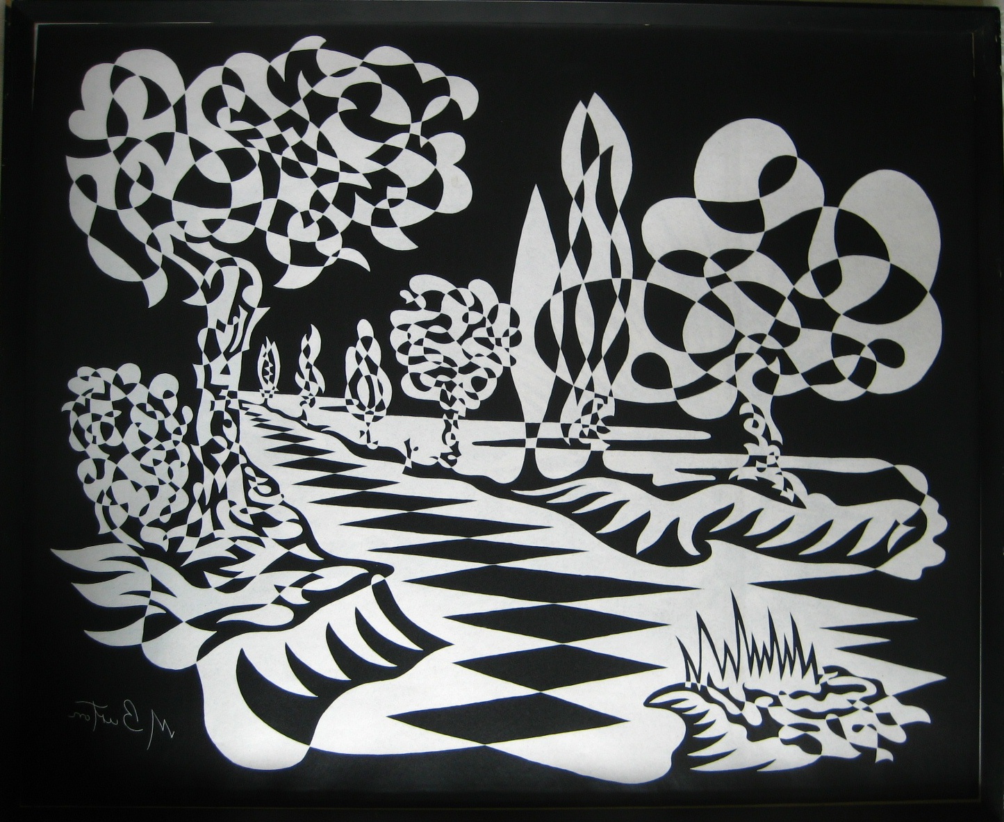037. 1970-5. River, or Skelldale by Moonlight. Negative alternate shade black. ← Previous Next → Skelldale negative. Single continuous line drawing. Mick Burton, continuous line artist, 1970.