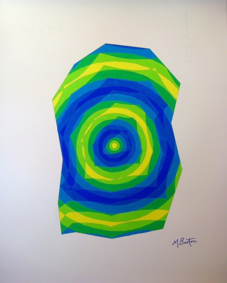 072. 1971-10. Reverse Ripple. Colour sequence. Green, blue. ← Previous Next → Reverse Ripple. Bounce lines with colour sequence. Mick Burton, continuous line artist, 1971.