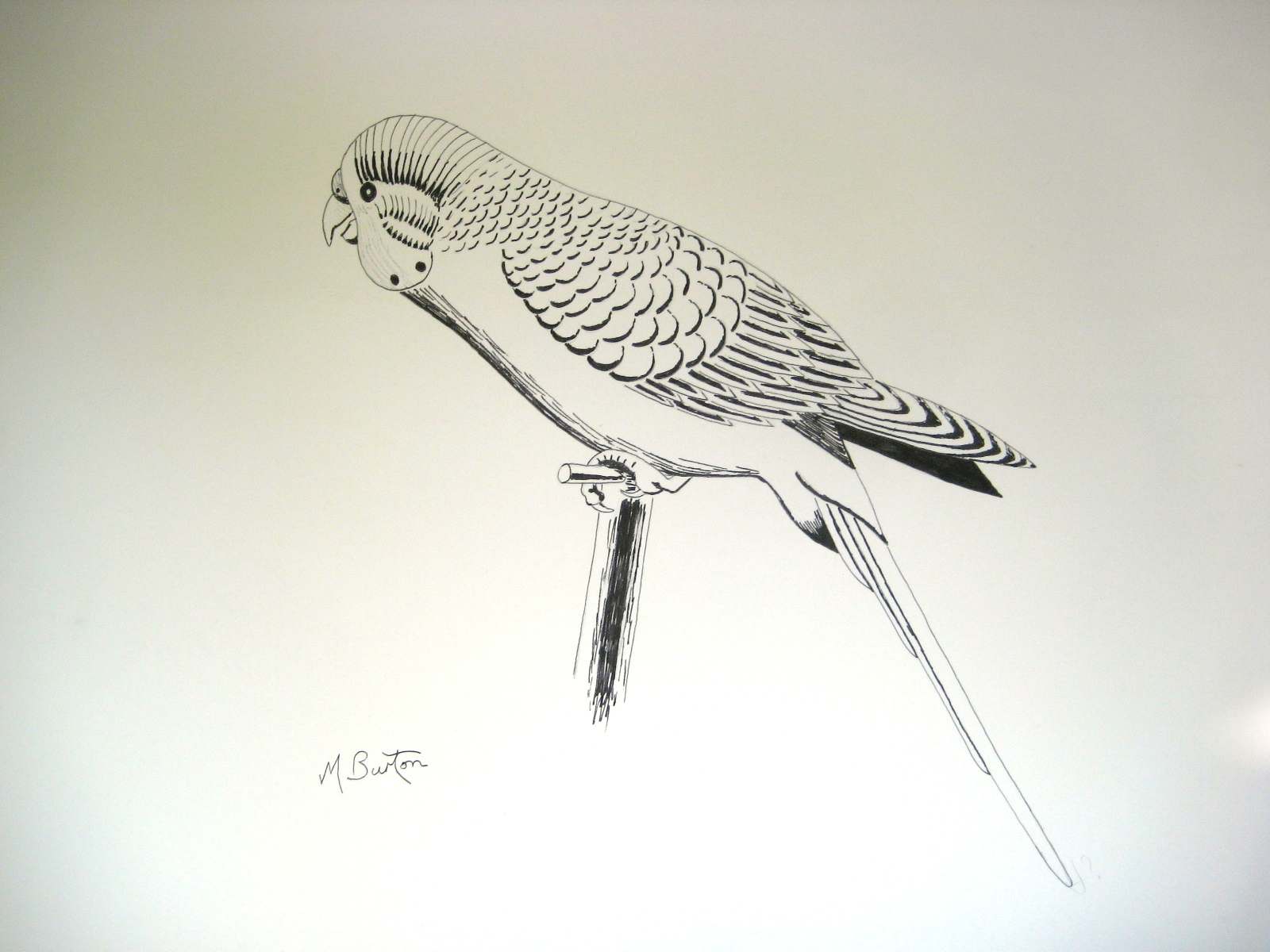 Budgie. Black and white sketch. Mick Burton, 1971 ← Previous Next → Budgie, Joey. I did this sketch in preparation for a continuous line drawing. Mick Burton, 1971 As you can see, the natural pattern on this bird is terrific. I could not have matched that.