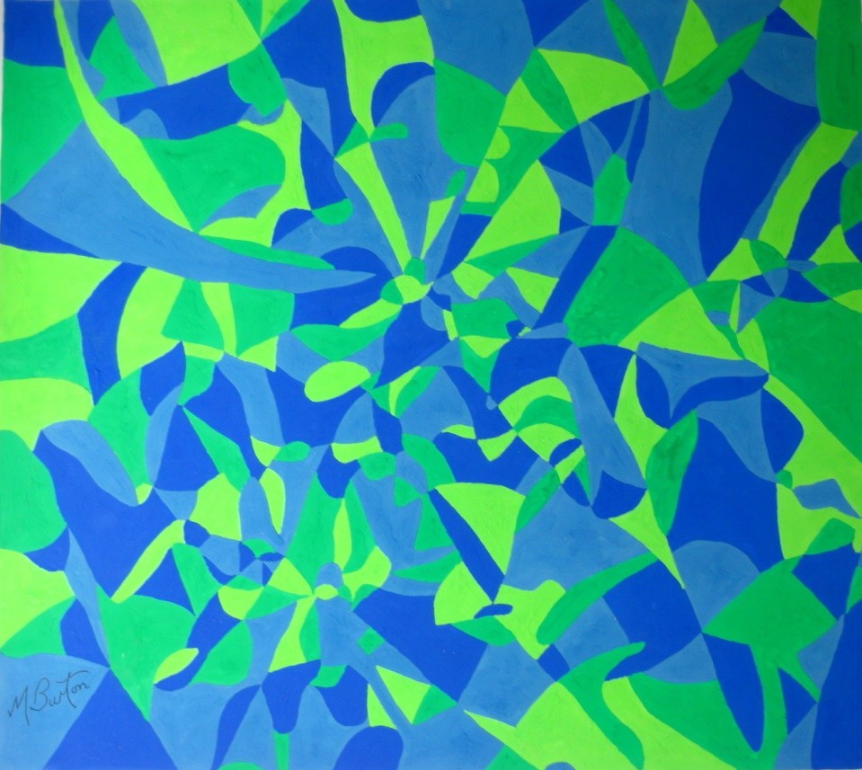 Reading Scientific America magazine had introduced my to Recreational Mathematics and the Four Colour Theorem, which had yet to be proved. I applied some of my ideas to my art. This now hangs in a house near Warwick.