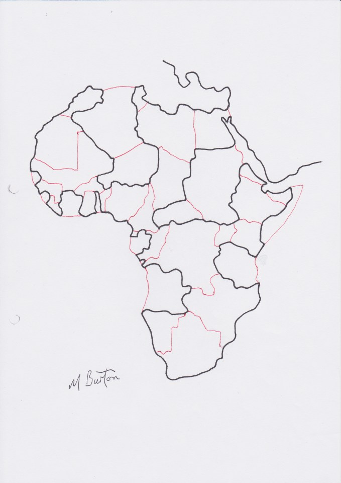 This map of Africal was in my school atlas of about 1958. The continuous line split the continent into two sequences of countries inside or outside the line. You can use two colours alternately inside the line and another pair of colours outside the line to only need four colours altold.
