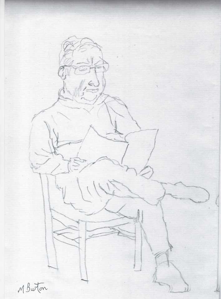 It was my first visit to an Art Club for many years. We drew lots from a hat to be the model and sketched each one for 10 minutes. Later at home Joan said, “Why don’t you do a continuous line of this one. So I did and took it along the next time.