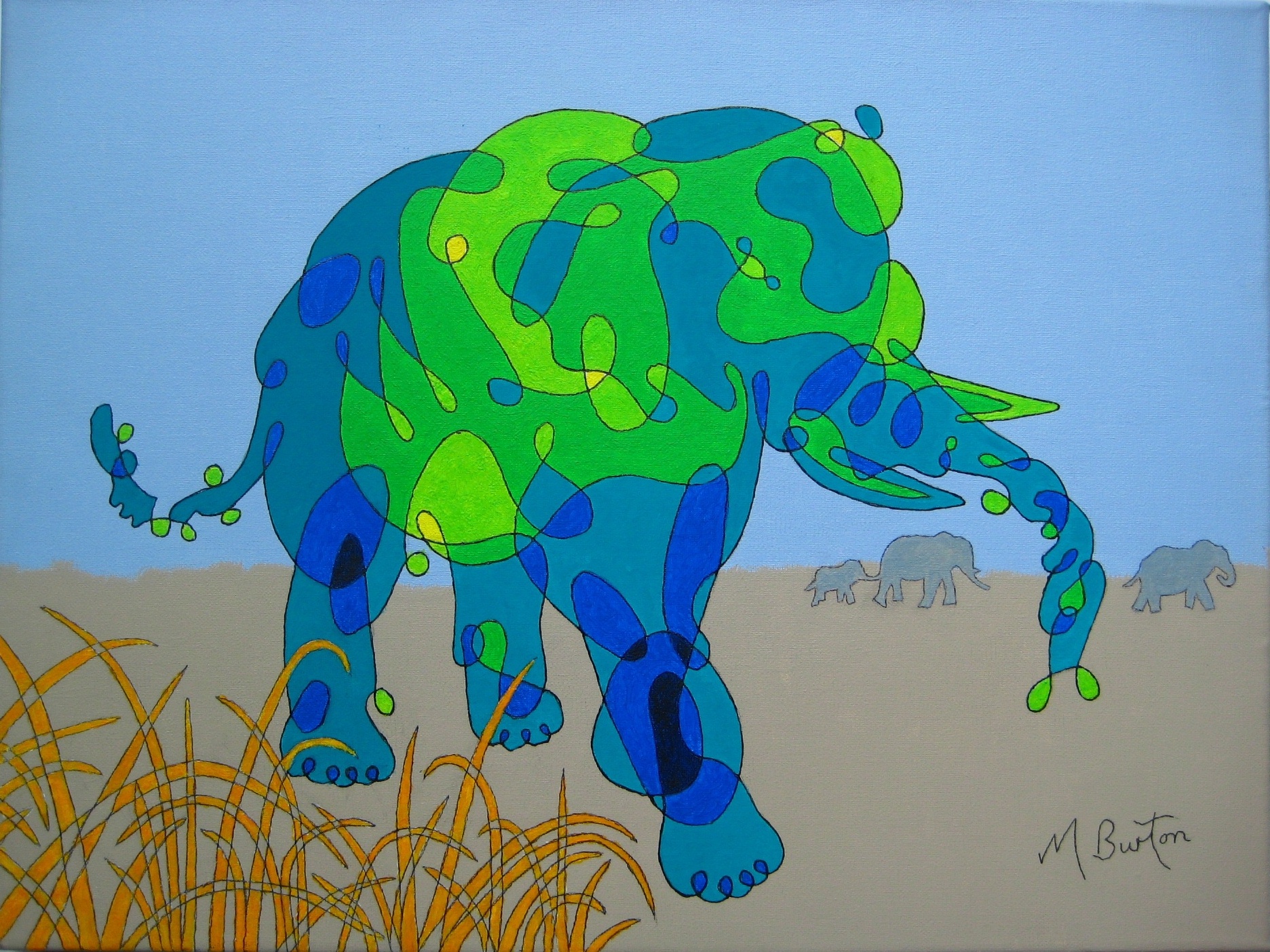 The Elephant continuous line started off as a Pink Elephant in 1966. I first used this yellow, green and blue sequence in 1971 when as “Fluorescephant” he appeared in two London Open exhibitions (International Amateur and the National Society, on the Mall). I thought it was time for him to be in an African setting.