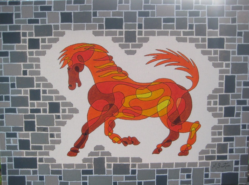 I have thought for some time that my colour sequence had a Stained Glass effect. I went to Ripon Cathedral School and spent a lot of time looking at the stained glass. In 2012 I was in Durham Cathedral and imagined a horse shaped window for my horse. There is no mortar between the stones in the wall and if you hold my canvas up to the sun the light shines through the gaps. It also looks good on the wall !