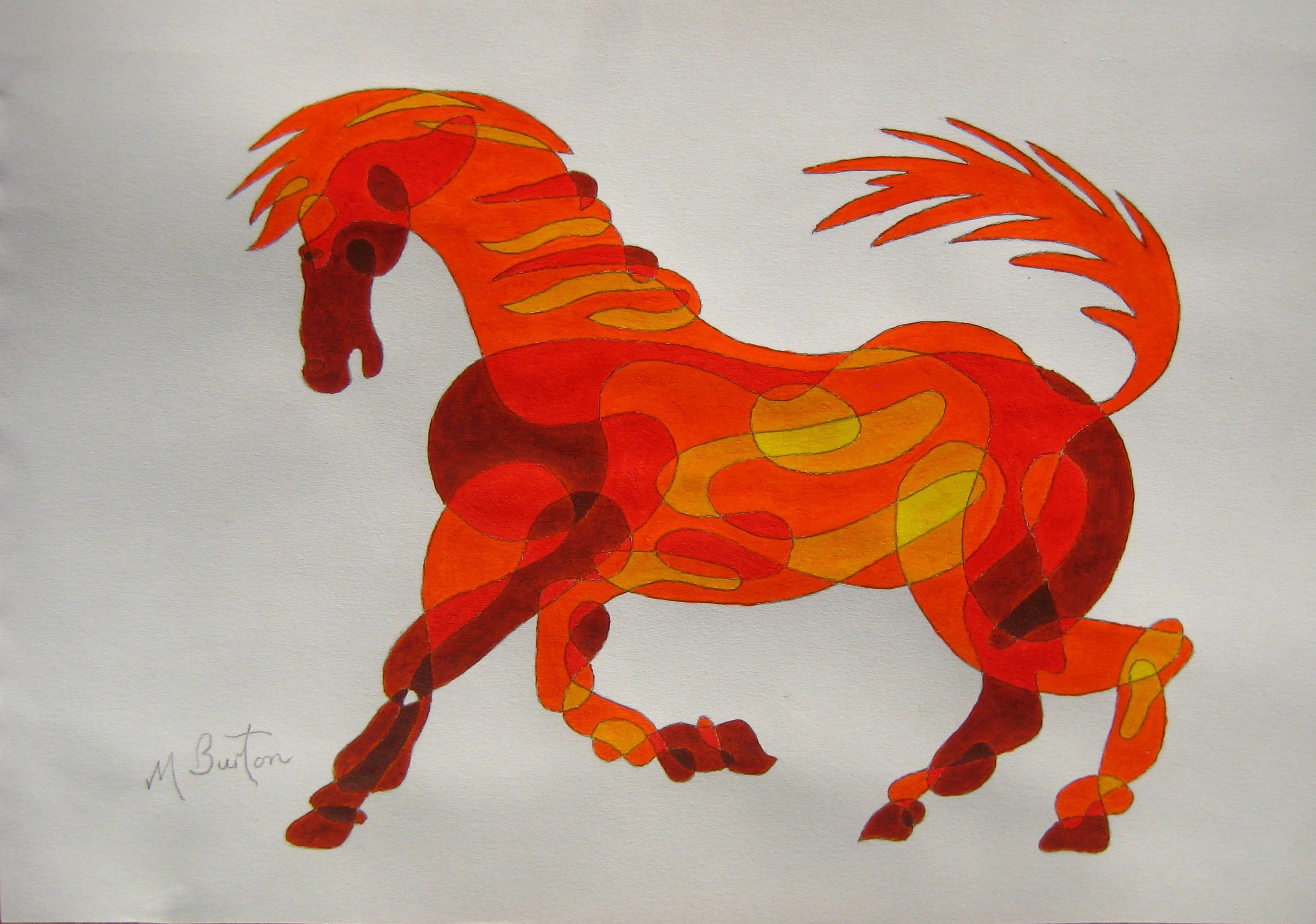 Fig 1. Completed Colour Sequence on Single Continuous Line Drawing of horse. Mick Burton, Continuous Line Blog.