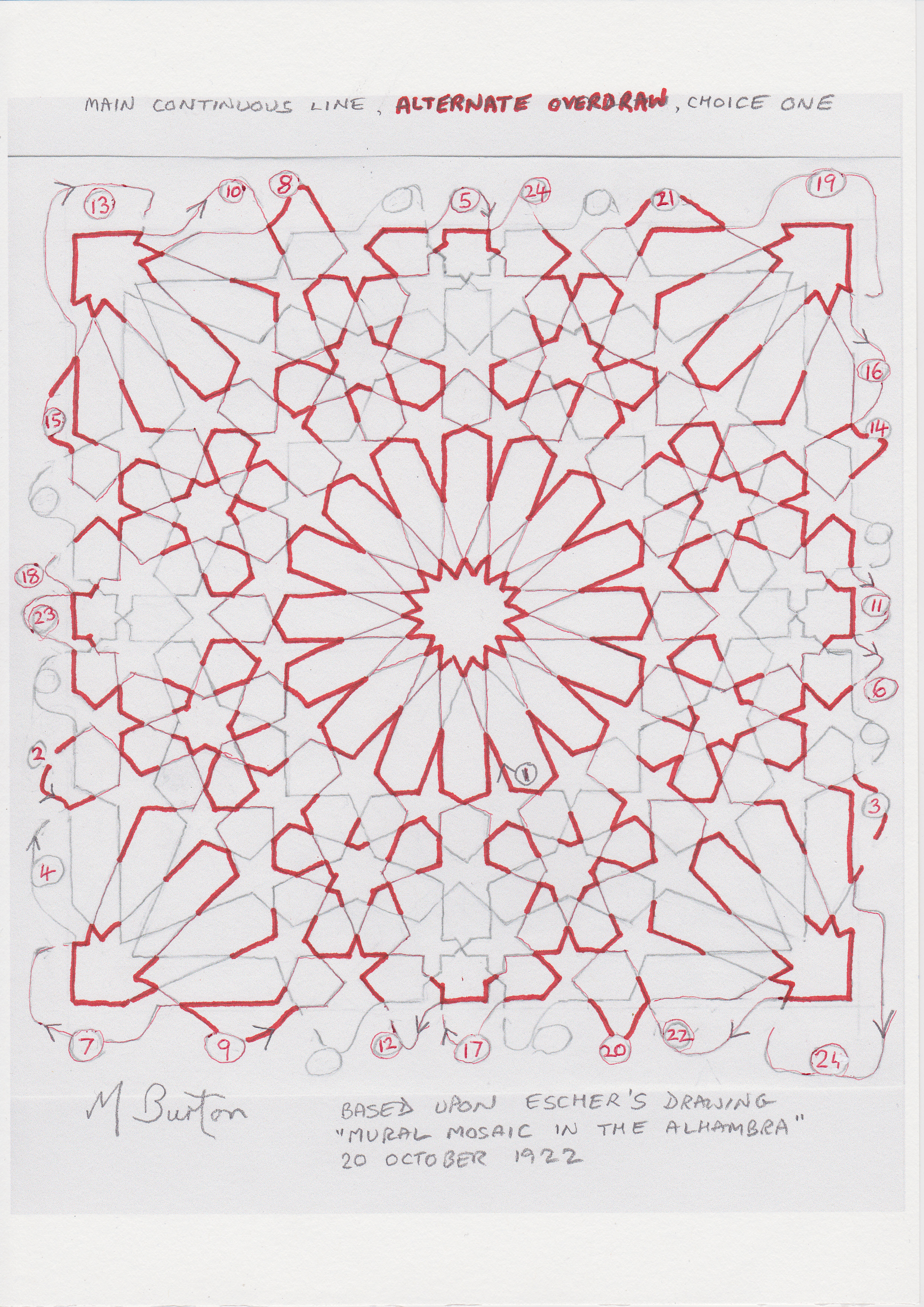 Main continuous line, Alternate Overdraw, choice 1. Mick Burton, Escher Mosaic study.