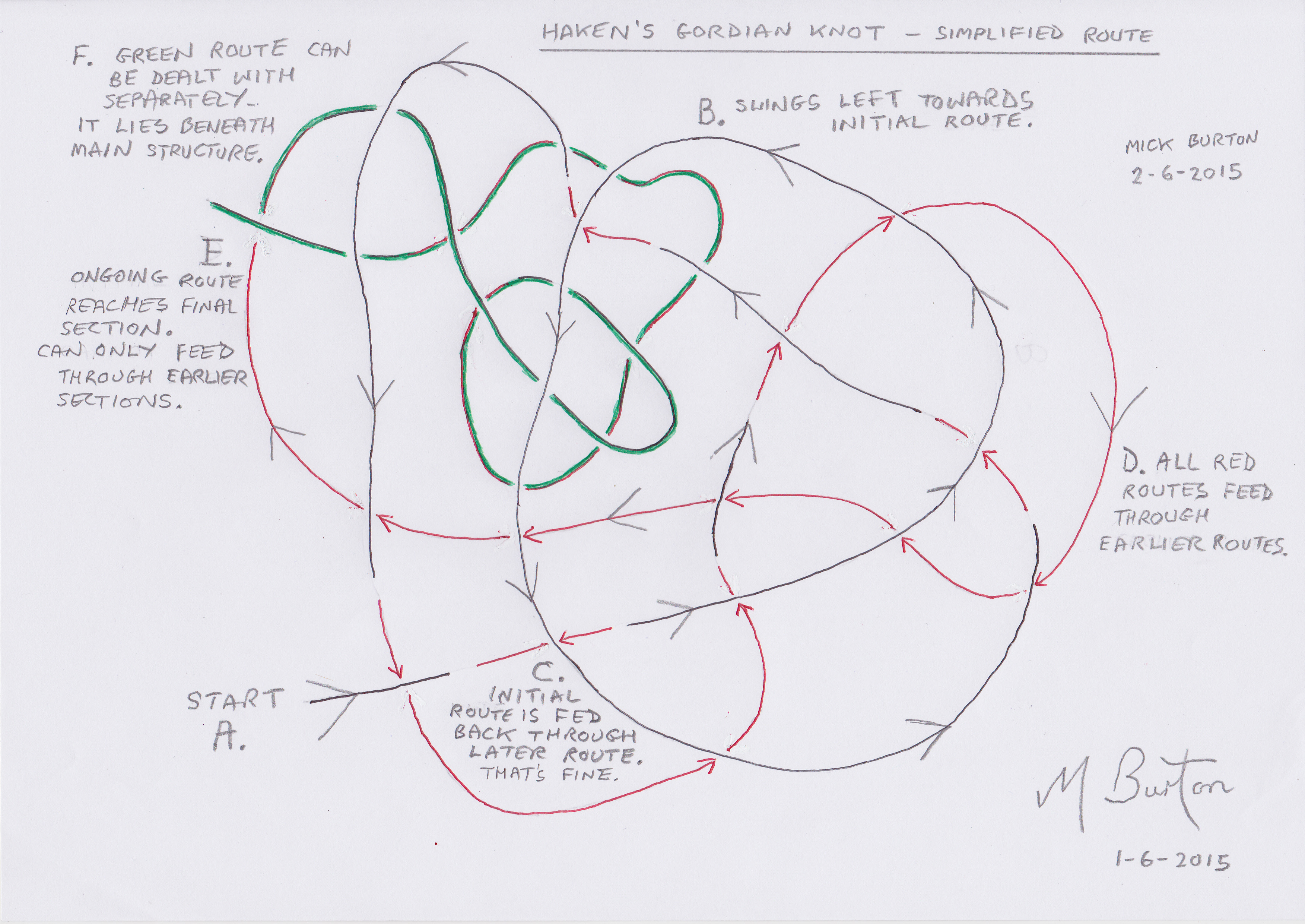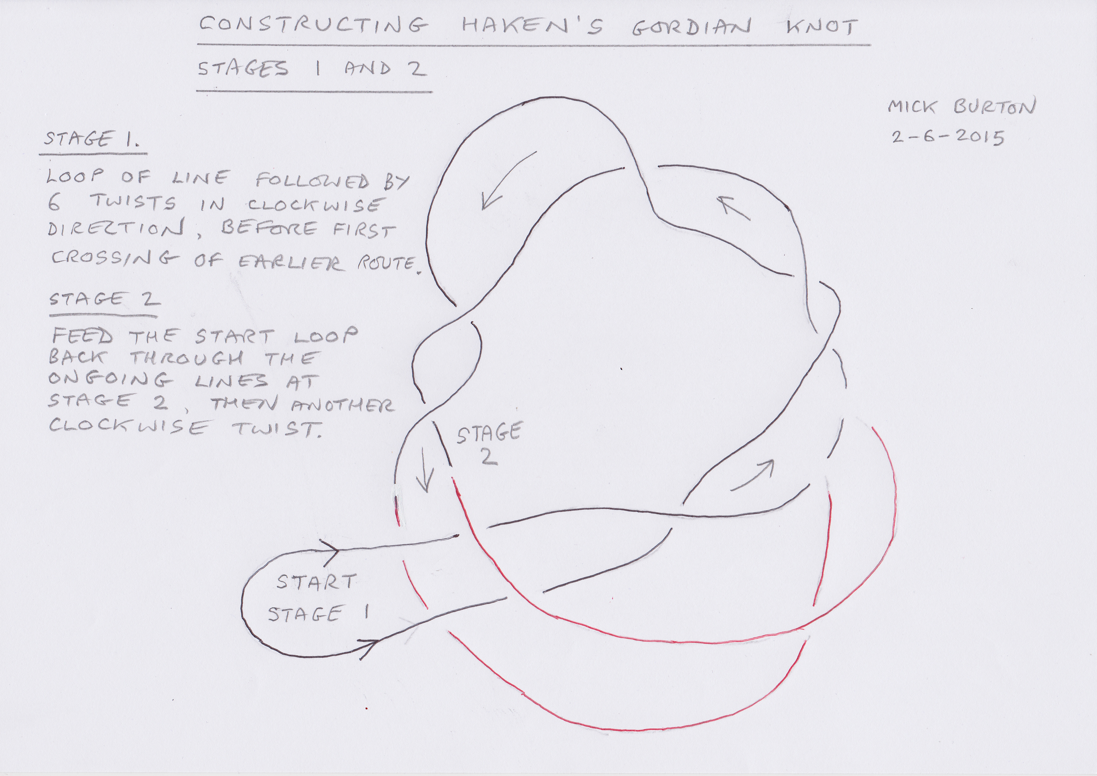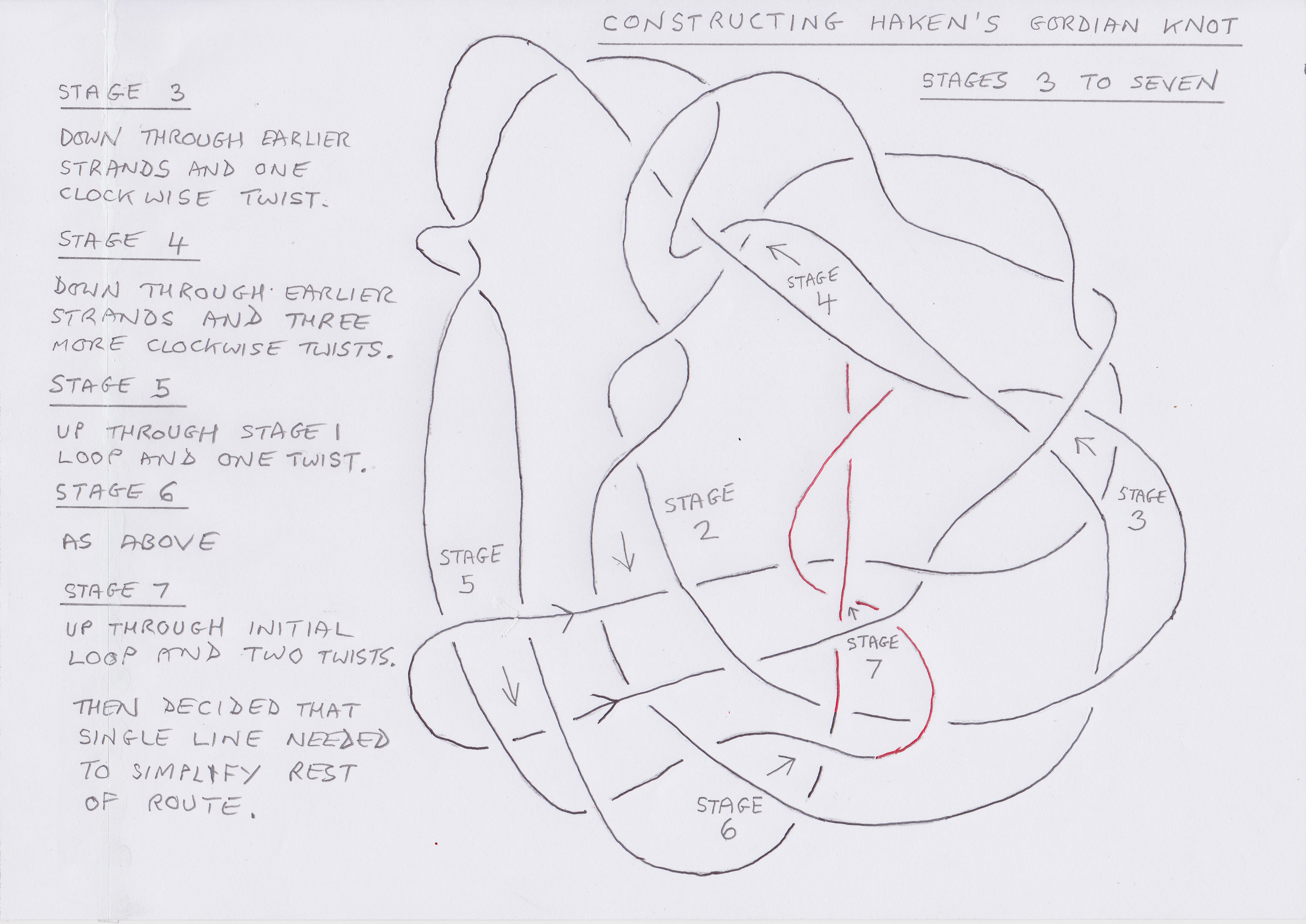 Even though I am an artist and not a mathematition, I had already done two pictures of Haken’s knot before I found the MathOverflow website and was fascinated by the production process of the knot and so did some extra diagrams of my own.