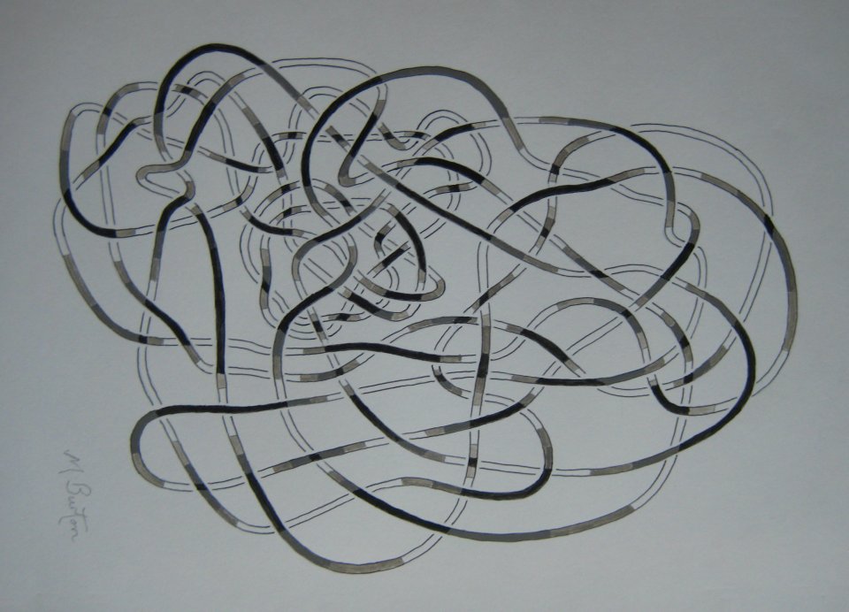 Having painted “Twisting, overlapping, envelope elephant”, I recognised some similar features in Haken’s famous knot. I spotted one loop on the low left side which I could follow its two strands into the picture and they roll clockwise over 30 times.