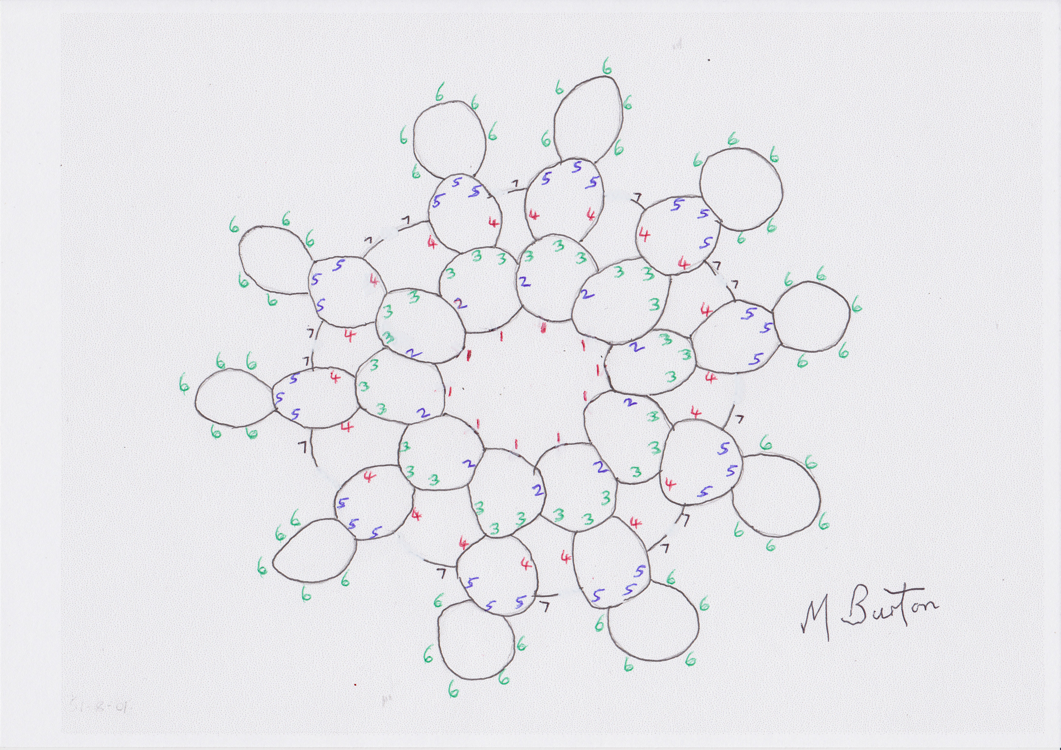 Here is my sketch of the skydivers formation.  It is made up of many linked circles, starting with a central ring of ten circles which radiate out to ten “petals”.  The plan seemed to involve six skydivers forming each circle by holding hands.  Some extra skydivers started links between petals.  I checked to see if I had included all the skydivers, which made my sketch look like a prickly cactus.