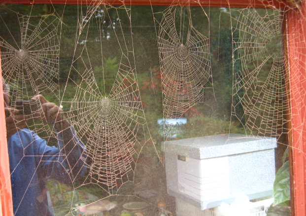 Large cobweb, on third dining room window, covered in red brick dust after work on kitchen extension in 2009. Mick Burton, continuous line artist.