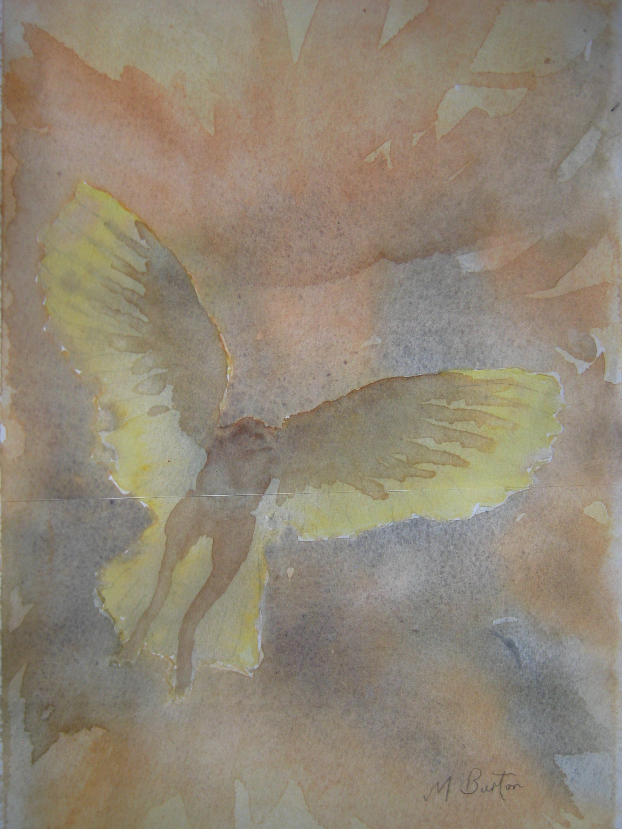 My usual style of strong lines and flat colours (acrylic or poster colour) are poles apart from watercolour but I always learn something.  I have to say that using a big brush to coat large proportions of the paper with water in advance (up to selected boundaries of course) and then squeezing brush loads of watercolour in dollops all over is a bit “hairy”.  Then picking up the paper and waving it about so that the colour swishes around, like tides on a beach, reminds me of relatives of mine “panning” for gold in Victoria in the 1850’s.