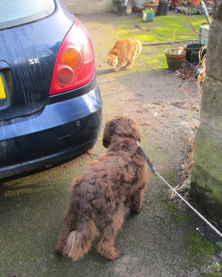 img_0541 ← Previous Next → Nessie spots a cat she has not seen before. Henry adopts defensive mode. Mick Burton, continuous line artist, Leeds.