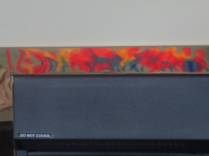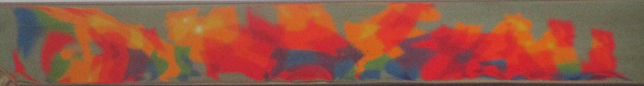 Joan and I visited my Aunty Ann a couple of weeks ago.  She is 99 years old and still as bright as a bobbin.  She is a good artist and only gave up painting relatively recently, and always wants to see my latest stuff.  i took the Wild Horses along.  It took up the length of the settee and she was delighted with the colours.  I then realised that the painting’s reflection in the shiny metal fire surround made the composition even more abstract.