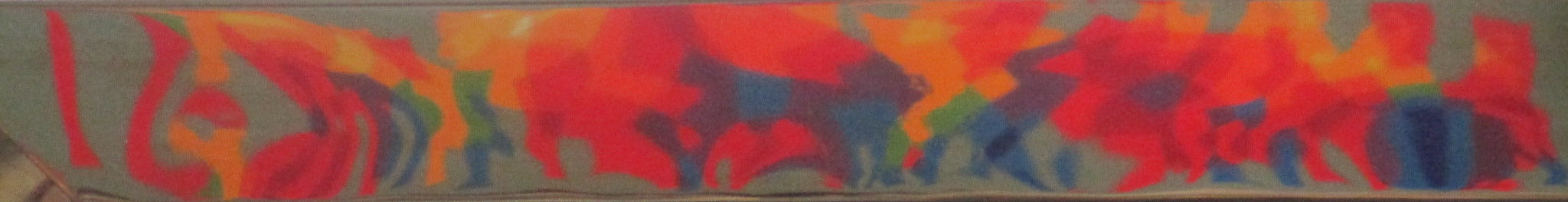 Kaleidoscopic Wild Horses. Single Continuous Line Drawing with colour sequence in acrylic on canvas.  I happened to have a canvas 36″ x 10″ previously intended for an upright picture idea.  Mick Burton continuous line artist 2017.