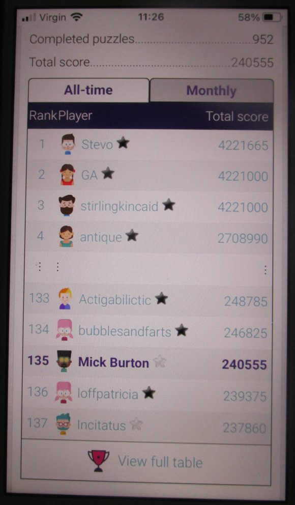 I mentioned in my post of 24.12.2020 that I was at position 272 out of the 863 people listed. Also that I had scored 17.925 points compared to the top rated Stirlingkincaid with 2,766,965. This was nearly twice the points of anyone else and I wondered if he ever slept.
