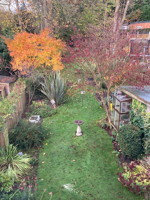 Red leaved Acer next to the garage drops leaves long before the bronze leaved one on the left. Photo Mick Burton, continuous line artist.