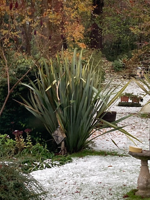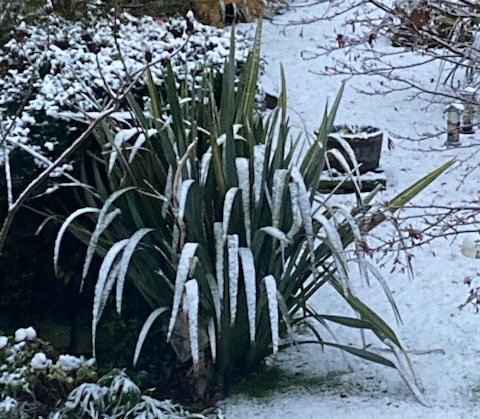 We have just had snow from Storm Burt and it weighed down some of the sword-like leaves of our sturdy Phormium.  Here is the photo below.