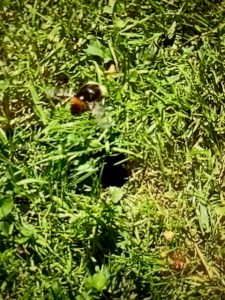 I first found out about Bees nesting in the ground when I was digging the tiers in the bank at the top of the garden. I became aware that an increasing number of bees were circling around me.  It was just couple of Bumble Bees at first then all sorts of sizes of bees, some appearing to be similar to hive bees, flying around me.  I realised that I must have disturbed their nest and so I stopped the digging for the day.  The next day I came to look and there was a new hole in the bank and bees coming out, so I just abandoned my digging for the summer.