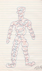 Drawing of Doug Eglen continuous metal sculpture, but with added quarter twist. Mick Burton, continuous line artist.