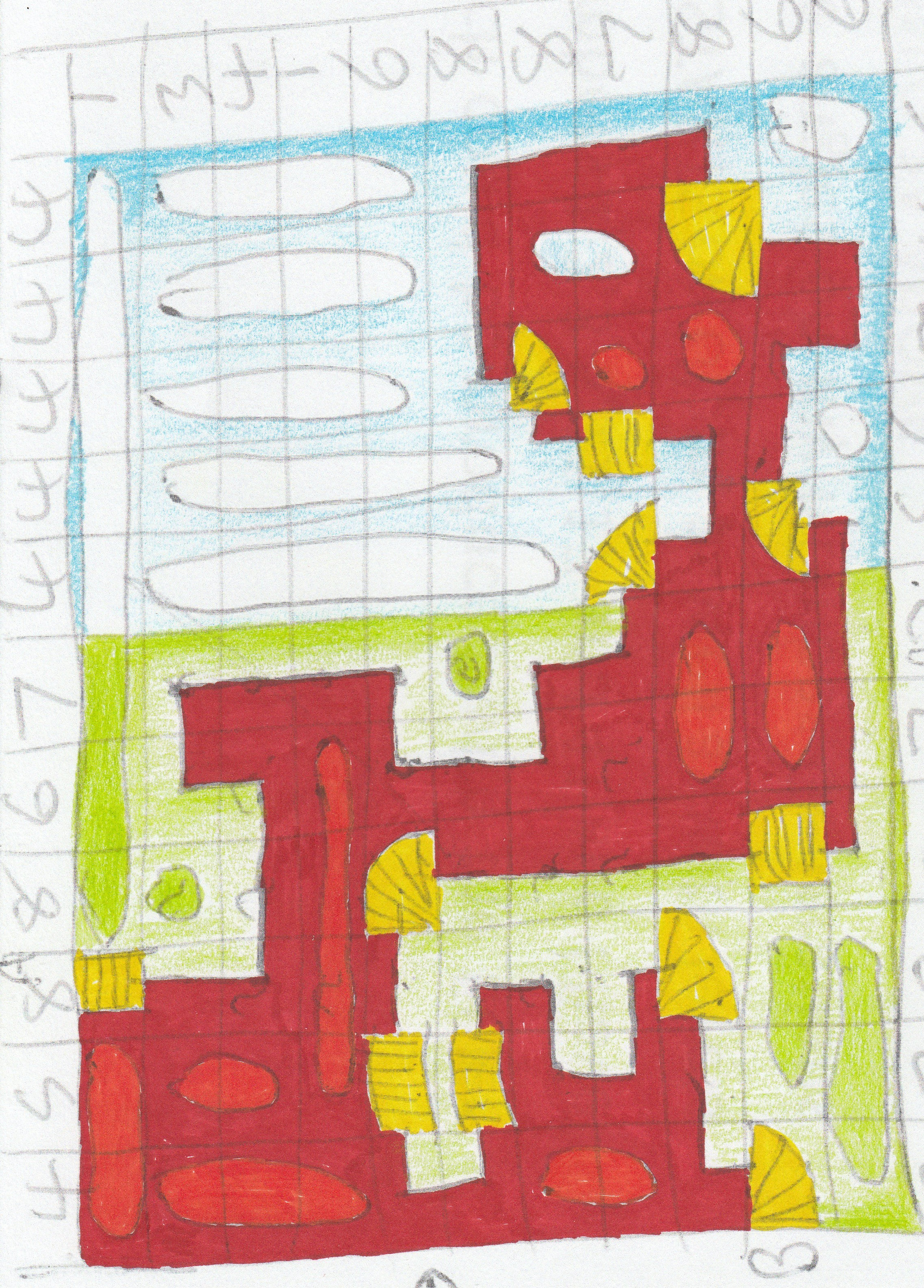 Drawing of Doug Eglen continuous metal sculpture with sides in four colours. Mick Burton, continuous line artist.