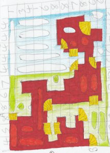 Black has now appeared at the top for half the time, so we have four colours on view. Another outcome is that the two sides, which are Green and Blue, swapped from one side to the other at the twists which has resulted in blue almost disappearing. This is due to the close photographic angle by Doug showing most of the insides of each boomerang shape and I coloured them almost equally Green and Blue in my first drawing. Green stayed the same within the Red boomerang here and Blue changed to Green in the new Black one.