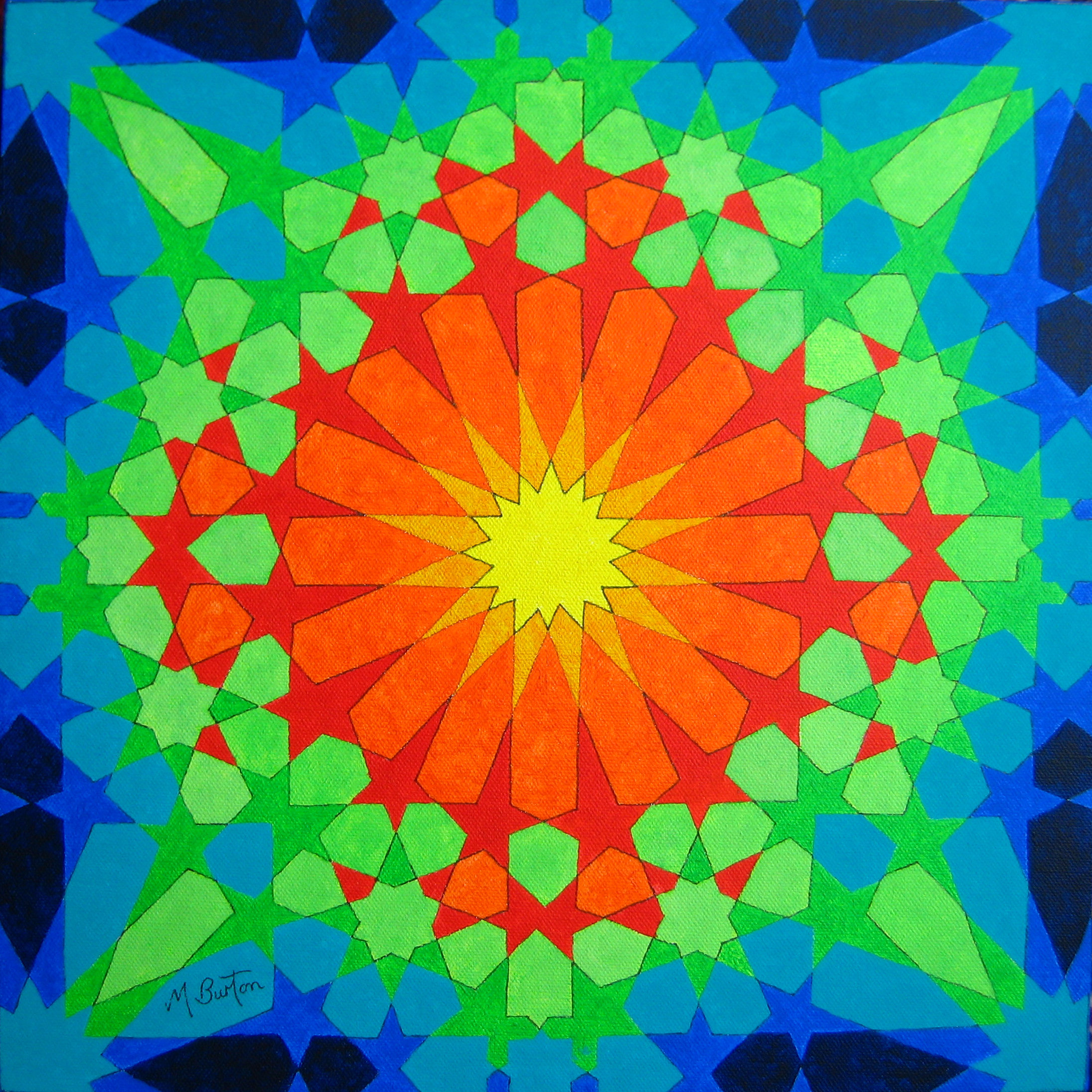 I produced a series of posts about the continuous lines within the tile observed by Escher in 1922 and showed a link to the colours originally used. My colour sequence could also be applied to the continuous lines and I have tried to suggest a central flower on vegetation background.