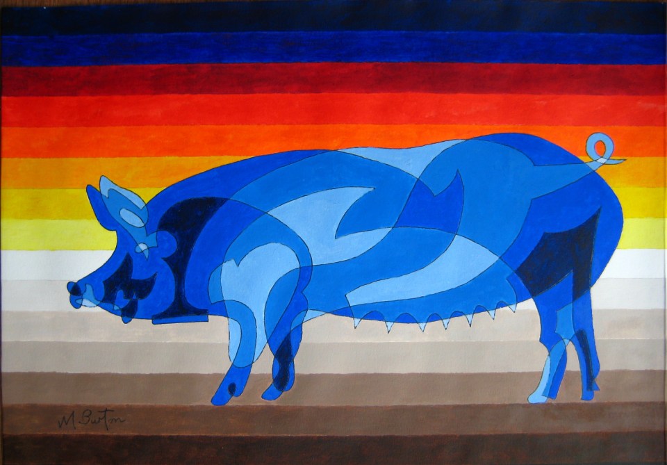 The pig was a demonstration continuous line drawing in February 2014 at Alwoodley Art Group in Leeds. The colours resulted from memories of drinking in The Blue Pig pub in Bradford. A blue sky with a blue pig would not work, so here is a reddish sky in rasher stripes.